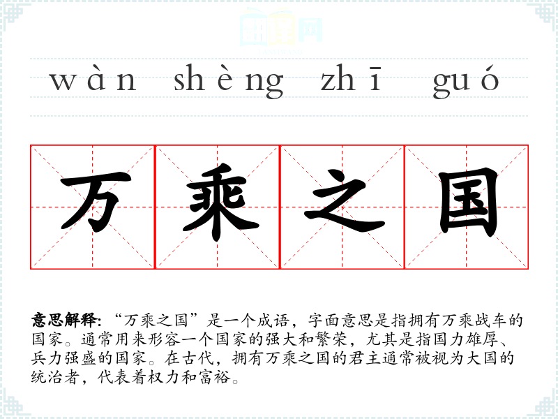 “万乘之国”源自《诗经》中的“万乘之国,万民之所归。”在古代**,战车是重要的军事装备,乘车数量的多寡直接反映一个国家的军事实力。因此,这个成语常常被用来指代强大的国家和权力。