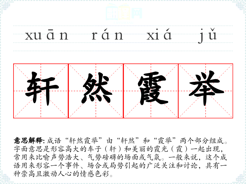 成语“轩然霞举”由“轩然”和“霞举”两个部分组成。字面意思是形容高大的车子(轩)和美丽的霞光(霞)一起出现,常用来比喻声势浩大、气势磅礴的场面或气氛。一般来说,这个成语用来形容一个**、场合或局势引起的广泛关注和讨论,具有一种崇高且激动人心的情感色彩。