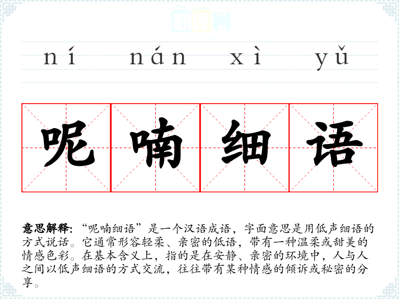 “呢喃”原本是形容鸟叫声的词汇,意指细微、轻柔的声音。此成语的具体出处并不明确,但在古代文学中常出现与低语、轻声交流相关的描写,反映了人们在情感交流中的细腻与亲密。
