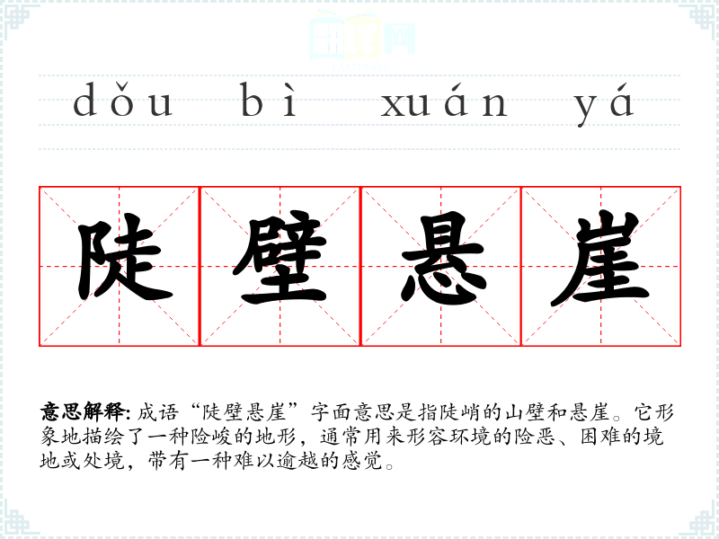 “陡壁悬崖”并不是一个古老的成语,而是由“陡壁”和“悬崖”两个词组合而成,反映了自然界的险峻地形。在古典文学中,常有描写险峻山势的句子,但“陡壁悬崖”作为一个整体成语的使用并不常见。其具体的文学出处相对较少,更多的是用来形容人们所面对的困难和挑战。