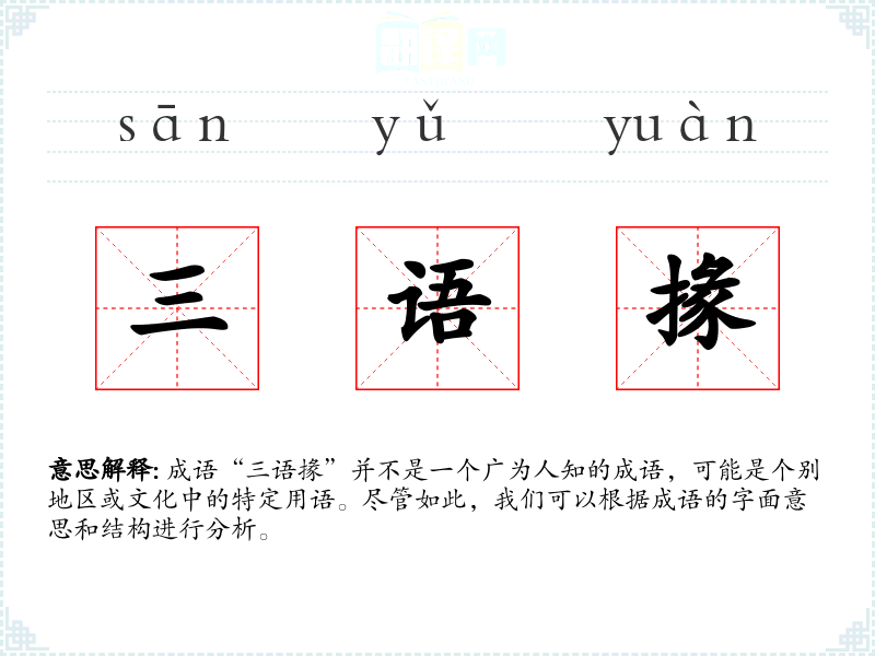 成语“三语掾”并不是一个广为人知的成语,可能是个别地区或文化中的特定用语。尽管如此,我们可以根据成语的字面意思和结构进行分析。