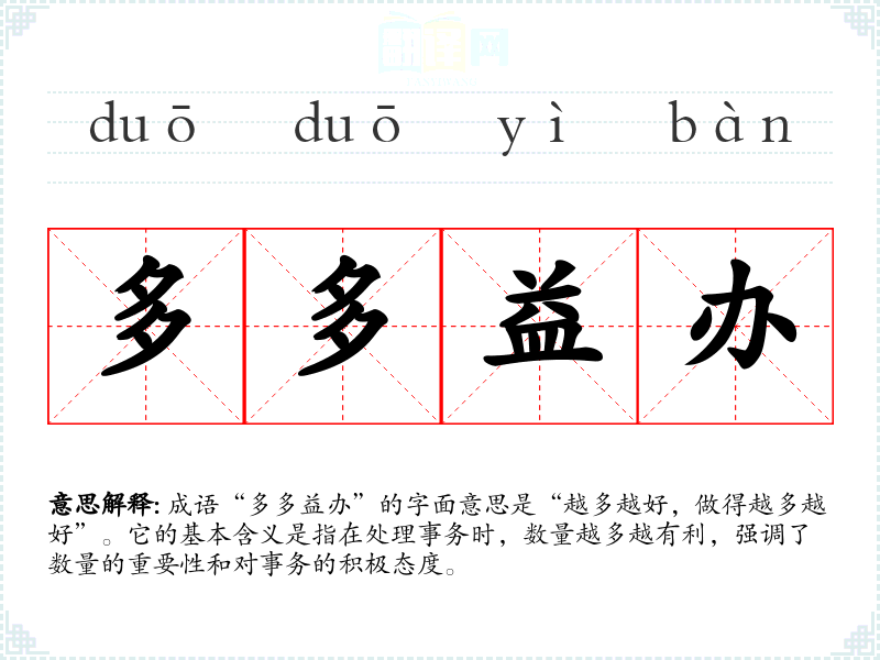 成语“多多益办”的字面意思是“越多越好,做得越多越好”。它的基本含义是指在处理事务时,数量越多越有利,强调了数量的重要性和对事务的积极态度。