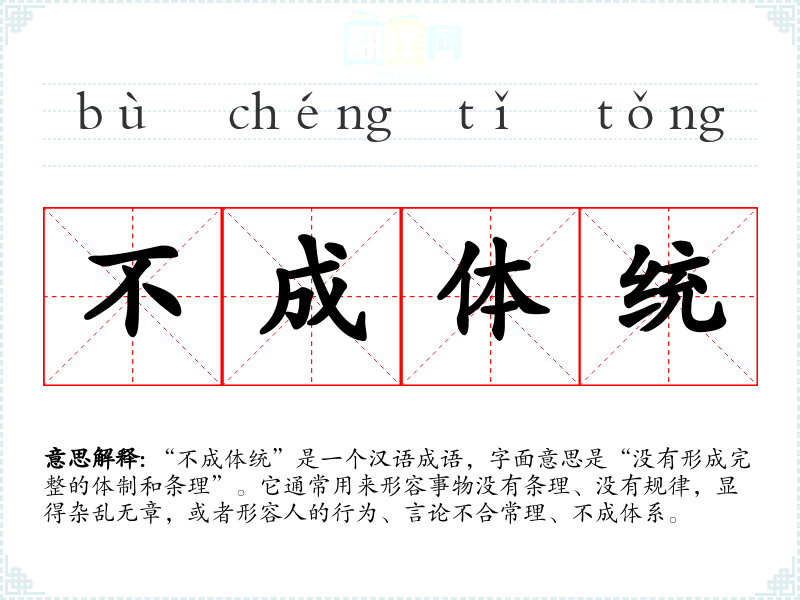 “不成体统”是一个汉语成语,字面意思是“没有形成完整的体制和条理”。它通常用来形容事物没有条理、没有规律,显得杂乱无章,或者形容人的行为、言论不合常理、不成体系。