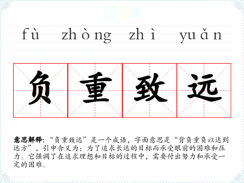 “负重致远”是一个成语,字面意思是“背负重负以达到远方”,引申含义为:为了追求长远的目标而承受眼前的困难和压力。它强调了在追求理想和目标的过程中,需要付出努力和承受一定的困难。