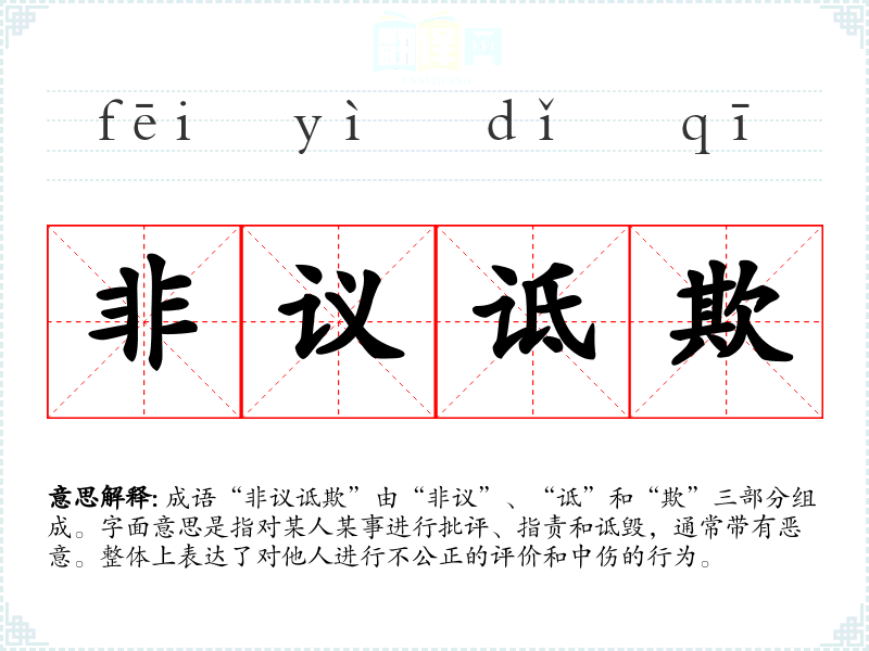 成语“非议诋欺”由“非议”、“诋”和“欺”三部分组成。字面意思是指对某人某事进行批评、指责和诋毁,通常带有恶意。整体上表达了对他人进行不公正的评价和中伤的行为。