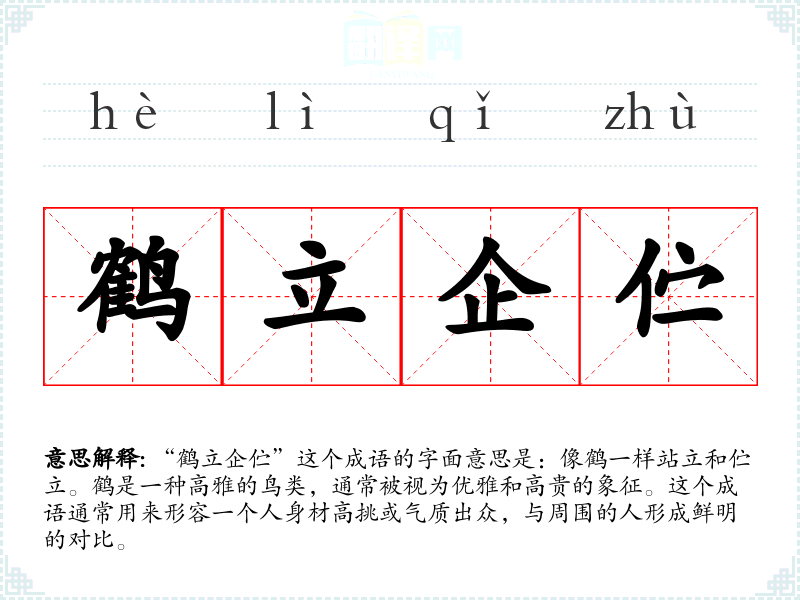“鹤立企伫”这个成语的字面意思是:像鹤一样站立和伫立。鹤是一种高雅的鸟类,通常被视为优雅和高贵的象征。这个成语通常用来形容一个人身材高挑或气质出众,与周围的人形成鲜明的对比。