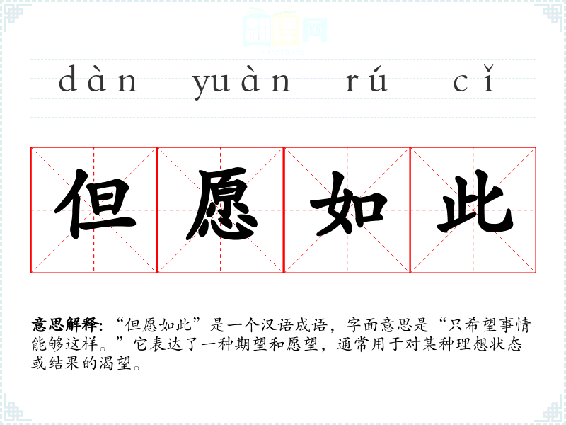 “但愿如此”是一个汉语成语,字面意思是“只希望事情能够这样。”它表达了一种期望和愿望,通常用于对某种理想状态或结果的渴望。