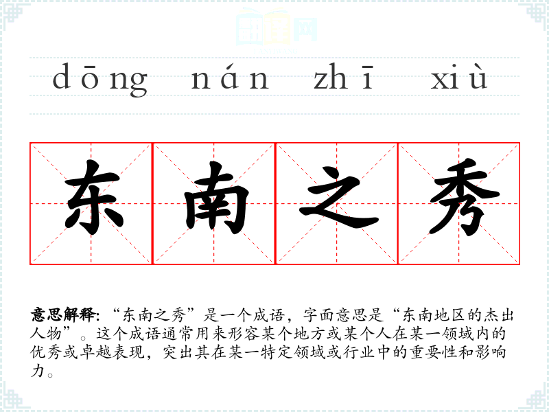 “东南之秀”是一个成语,字面意思是“东南地区的杰出人物”。这个成语通常用来形容某个地方或某个人在某一领域内的优秀或卓越表现,突出其在某一特定领域或行业中的重要性和影响力。