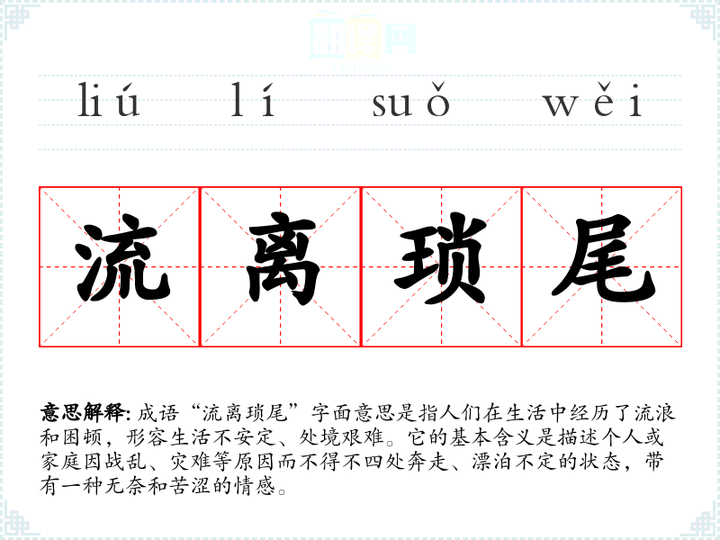 “流离琐尾”这一成语的具体历史背景较为模糊,可能与**历史上多次的战乱和动荡相关。流离意指流浪、漂泊,而琐尾则暗示着零散的、琐碎的生活状态。这一成语可能源于古代诗词或文学作品中对苦难生活的描绘,强调个体在社会动荡中的脆弱与无奈。