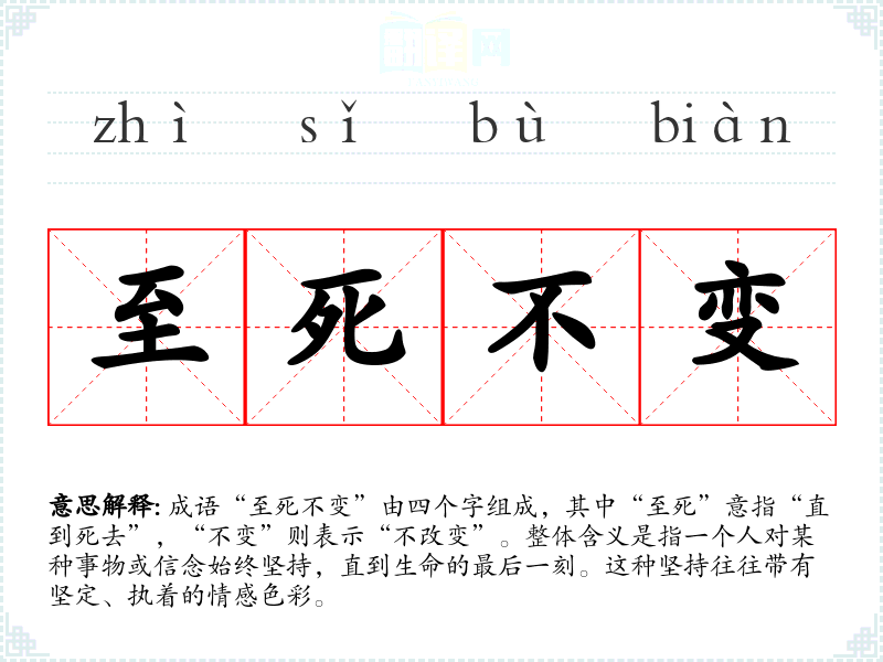 在英语中,与“至死不变”相近的表达是“steadfast until death”,同样强调一种坚定的信念。这种表达在西方文化中也常被用于描述对爱情、信仰或理念的忠诚,体现了不同文化中对坚守信念的共鸣。