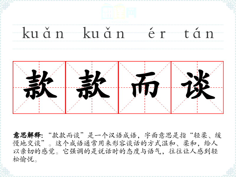 “款款而谈”是一个汉语成语,字面意思是指“轻柔、缓慢地交谈”。这个成语通常用来形容谈话的方式温和、柔和,给人以亲切的感觉。它强调的是说话时的态度与语气,往往让人感到轻松愉悦。
