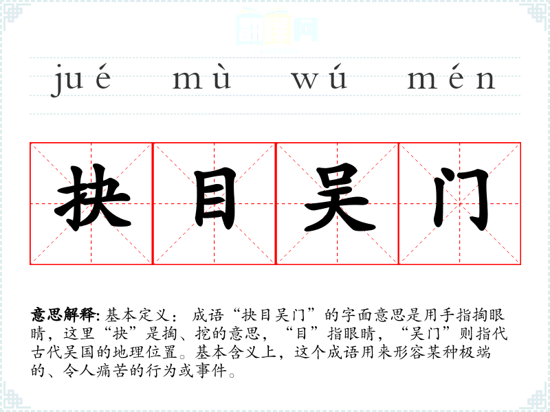 成语来源: 该成语源于古代的历史和文化背景,吴门在古代指代今江苏省的苏州地区,因其风景优美而闻名。抉目一词则常见于古代文学作品中,用于形容受到极大痛苦或折磨。具体的文学出处可能并不明确,但它反映了古代文学对痛苦和残忍的描绘。