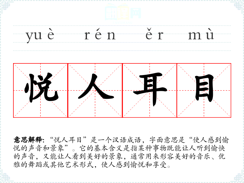 “悦人耳目”是一个汉语成语,字面意思是“使人感到愉悦的声音和景象”。它的基本含义是指某种事物既能让人听到愉快的声音,又能让人看到美好的景象,通常用来形容美好的音乐、优雅的舞蹈或其他艺术形式,使人感到愉悦和享受。