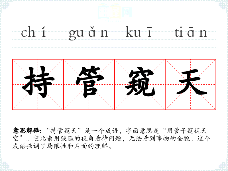 “持管窥天”是一个成语,字面意思是“用管子窥视天空”。它比喻用狭隘的视角看待问题,无法看到事物的全貌。这个成语强调了局限性和片面的理解。