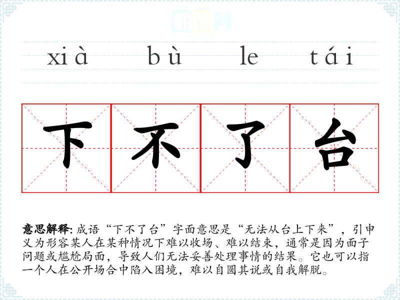 成语“下不了台”字面意思是“无法从台上下来”,引申义为形容某人在某种情况下难以收场、难以结束,通常是因为面子问题或尴尬局面,导致人们无法妥善处理事情的结果。它也可以指一个人在公开场合中陷入困境,难以自圆其说或自我解脱。