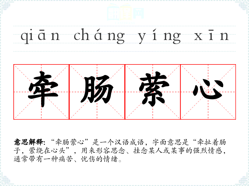 “牵肠萦心”是一个汉语成语,字面意思是“牵扯着肠子,萦绕在心头”,用来形容思念、挂念某人或某事的强烈情感,通常带有一种痛苦、忧伤的情绪。