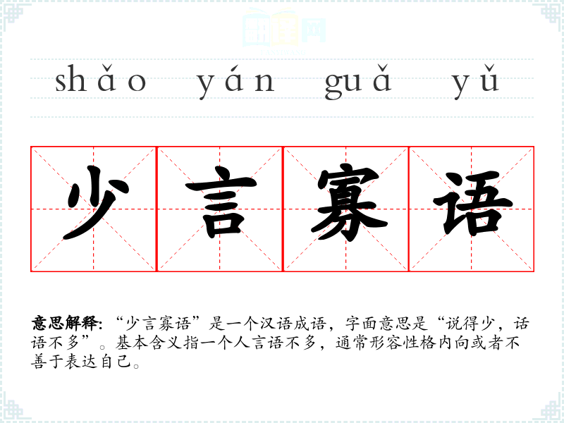 “少言寡语”是一个汉语成语,字面意思是“说得少,话语不多”。基本含义指一个人言语不多,通常形容性格内向或者不善于表达自己。