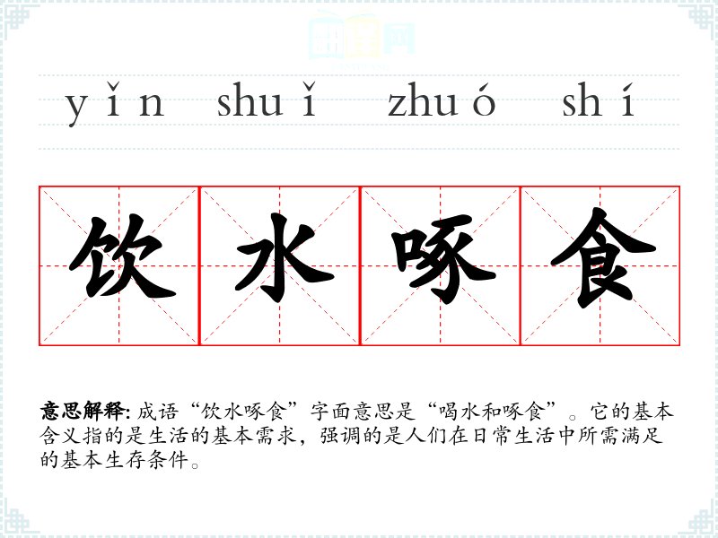 成语“饮水啄食”字面意思是“喝水和啄食”。它的基本含义指的是生活的基本需求,强调的是人们在日常生活中所需满足的基本生存条件。