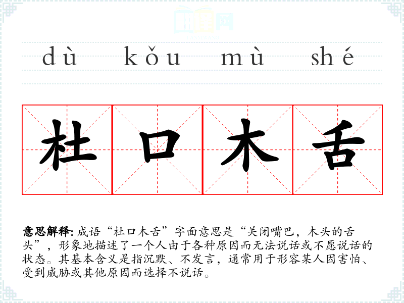 成语“杜口木舌”字面意思是“关闭嘴巴,木头的舌头”,形象地描述了一个人由于各种原因而无法说话或不愿说话的状态。其基本含义是指沉默、不发言,通常用于形容某人因害怕、受到威胁或其他原因而选择不说话。