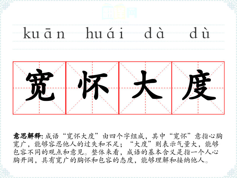 成语“宽怀大度”由四个字组成,其中“宽怀”意指心胸宽广,能够容忍他人的过失和不足;“大度”则表示气量大,能够包容不同的观点和意见。整体来看,成语的基本含义是指一个人心胸开阔,具有宽广的胸怀和包容的态度,能够理解和接纳他人。