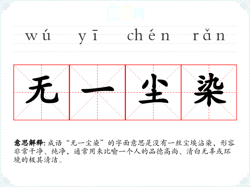 | 无一尘染 | 原指佛教徒修行时,排除物欲,保持心地洁净。现泛指丝毫不受坏习惯,坏风气的影响。也用来形容非常清洁、干净。 |