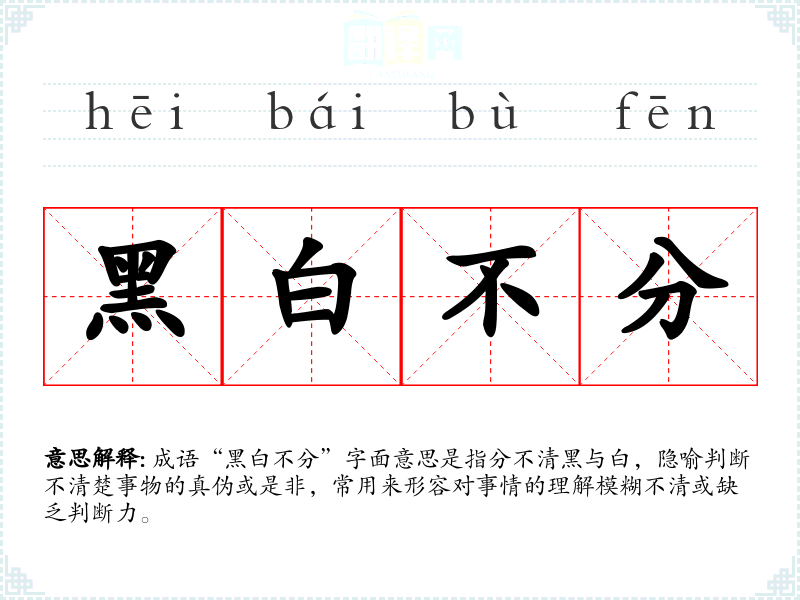 成语“黑白不分”字面意思是指分不清黑与白,隐喻判断不清楚事物的真伪或是非,常用来形容对事情的理解模糊不清或缺乏判断力。