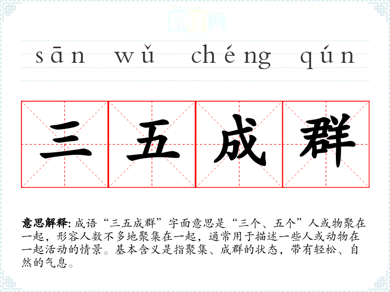 成语“三五成群”字面意思是“三个、五个”人或物聚在一起,形容人数不多地聚集在一起,通常用于描述一些人或动物在一起活动的情景。基本含义是指聚集、成群的状态,带有轻松、自然的气息。