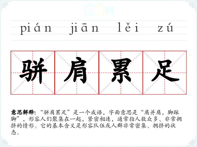 “骈肩累足”是一个成语,字面意思是“肩并肩,脚踩脚”,形容人们聚集在一起,紧密相连,通常指人数众多、非常拥挤的情形。它的基本含义是形容队伍或人群非常密集、拥挤的状态。