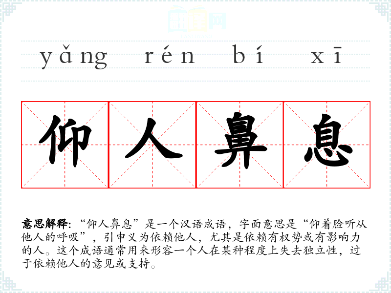 “仰人鼻息”是一个汉语成语,字面意思是“仰着脸听从他人的呼吸”,引申义为依赖他人,尤其是依赖有权势或有影响力的人。这个成语通常用来形容一个人在某种程度上失去独立性,过于依赖他人的意见或支持。