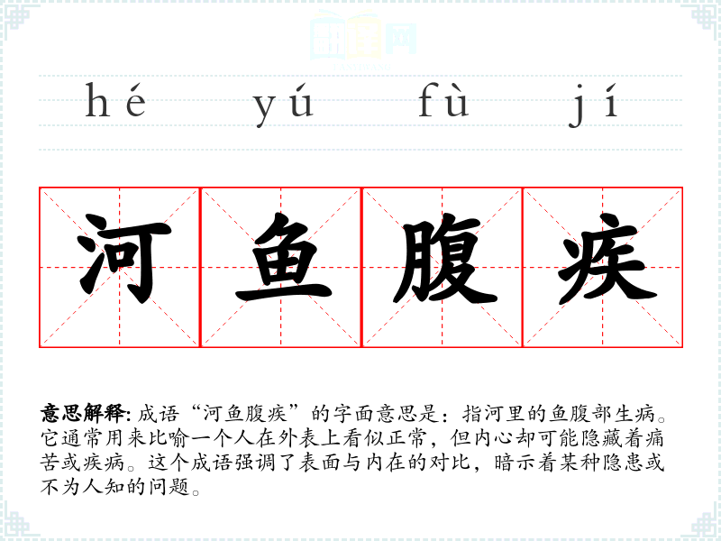 成语“河鱼腹疾”的字面意思是:指河里的鱼腹部生病。它通常用来比喻一个人在外表上看似正常,但内心却可能隐藏着痛苦或疾病。这个成语强调了表面与内在的对比,暗示着某种隐患或不为人知的问题。