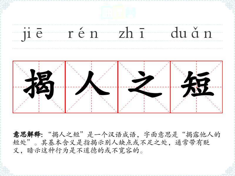 “揭人之短”是一个汉语成语,字面意思是“揭露他人的短处”。其基本含义是指揭示别人缺点或不足之处,通常带有贬义,暗示这种行为是不道德的或不宽容的。
