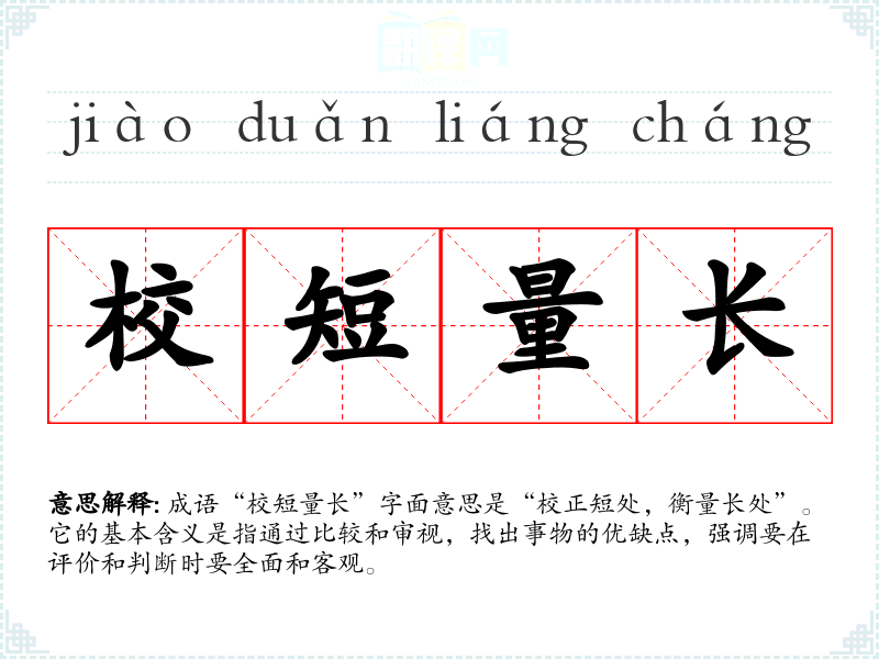 成语“校短量长”字面意思是“校正短处,衡量长处”。它的基本含义是指通过比较和审视,找出事物的优缺点,强调要在评价和判断时要全面和客观。