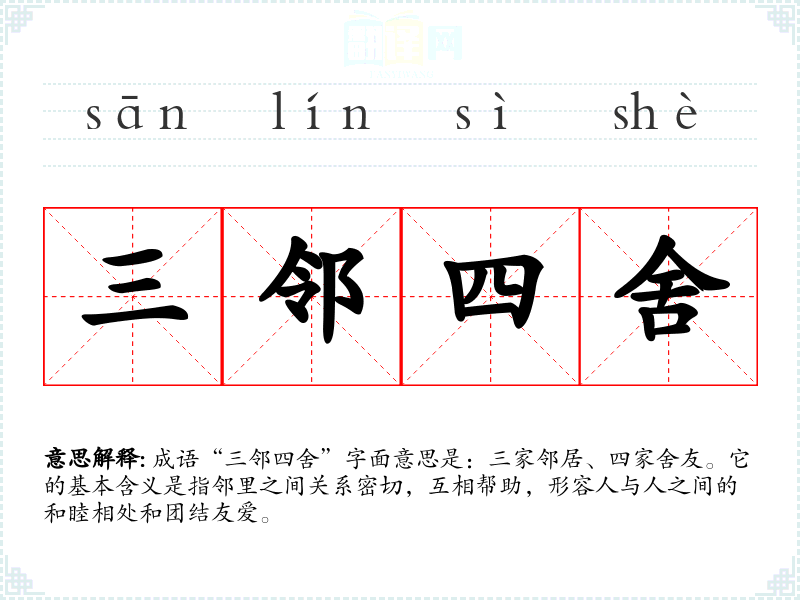 成语“三邻四舍”字面意思是:三家邻居、四家舍友。它的基本含义是指邻里之间关系密切,互相帮助,形容人与人之间的和睦相处和团结友爱。