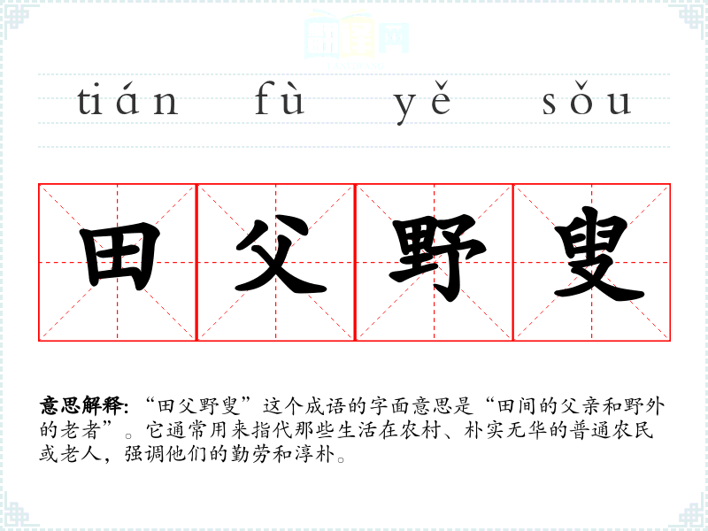 “田父野叟”这个成语的字面意思是“田间的父亲和野外的老者”。它通常用来指代那些生活在农村、朴实无华的普通农民或老人,强调他们的勤劳和淳朴。