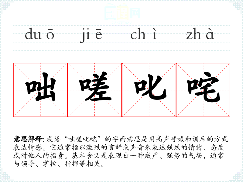 成语“咄嗟叱咤”的字面意思是用高声呼喊和训斥的方式表达情感。它通常指以激烈的言辞或声音来表达强烈的情绪、态度或对他人的指责。基本含义是表现出一种威严、强势的气场,通常与领导、掌控、指挥等相关。