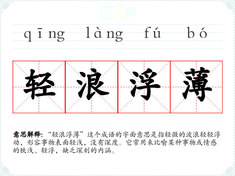 “轻浪浮*”这个成语的字面意思是指轻微的波浪轻轻浮动,形容事物表面轻浅,没有深度。它常用来比喻某种事物或情感的肤浅、轻浮,缺乏深刻的内涵。