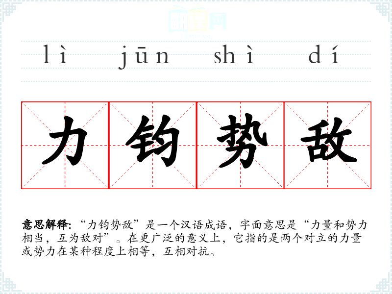 “力钧势敌”是一个汉语成语,字面意思是“力量和势力相当,互为敌对”。在更广泛的意义上,它指的是两个对立的力量或势力在某种程度上相等,互相对抗。