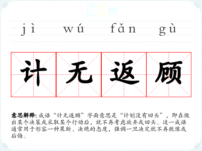 成语“计无返顾”字面意思是“计划没有回头”,即在做出某个决策或采取某个行动后,就不再考虑放弃或回头。这一成语通常用于形容一种果断、决绝的态度,强调一旦决定就不再犹豫或后悔。