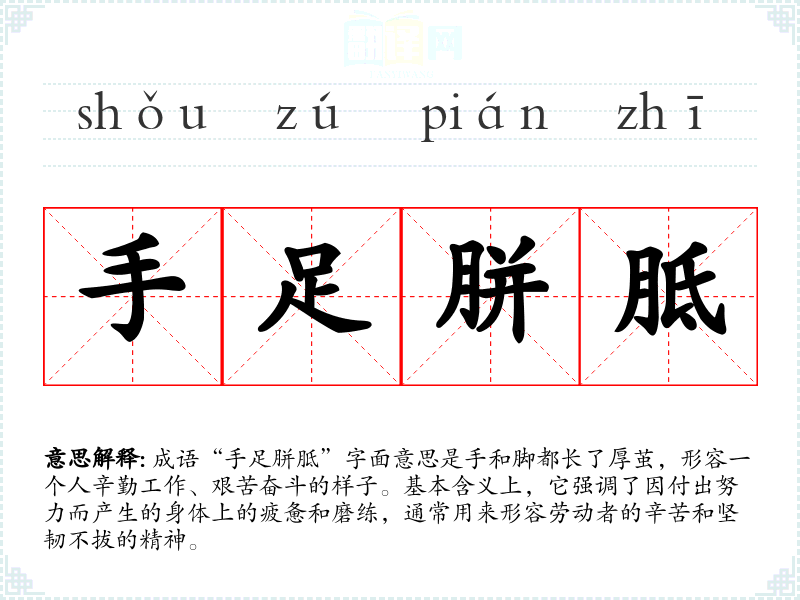 成语“手足胼胝”字面意思是手和脚都长了厚茧,形容一个人辛勤工作、艰苦奋斗的样子。基本含义上,它强调了因付出努力而产生的身体上的疲惫和磨练,通常用来形容劳动者的辛苦和坚韧不拔的精神。