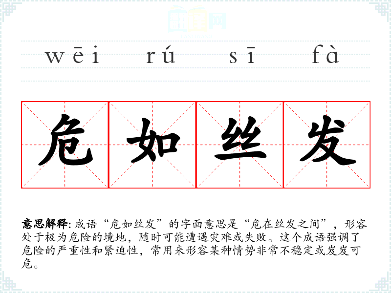 成语“危如丝发”的字面意思是“危在丝发之间”,形容处于极为危险的境地,随时可能遭遇灾难或失败。这个成语强调了危险的严重性和紧迫性,常用来形容某种情势非常不稳定或岌岌可危。