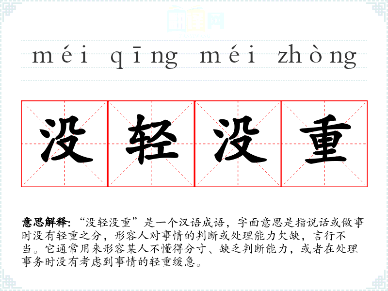 “没轻没重”是一个汉语成语,字面意思是指说话或做事时没有轻重之分,形容人对事情的判断或处理能力欠缺,言行不当。它通常用来形容某人不懂得分寸、缺乏判断能力,或者在处理事务时没有考虑到事情的轻重缓急。