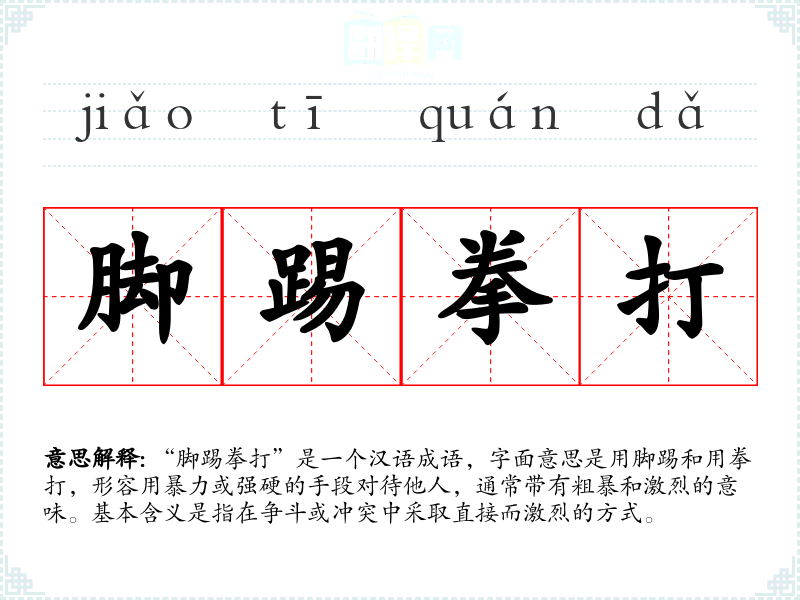 “脚踢拳打”是一个汉语成语,字面意思是用脚踢和用拳打,形容用暴力或强硬的手段对待他人,通常带有粗暴和激烈的意味。基本含义是指在争斗或冲突中采取直接而激烈的方式。