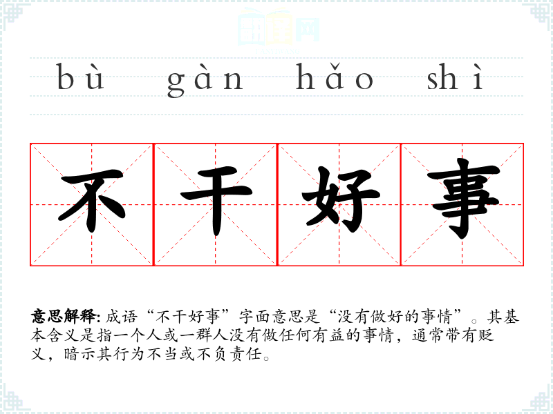 成语“不干好事”字面意思是“没有做好的事情”。其基本含义是指一个人或一群人没有做任何有益的事情,通常带有贬义,暗示其行为不当或不负责任。