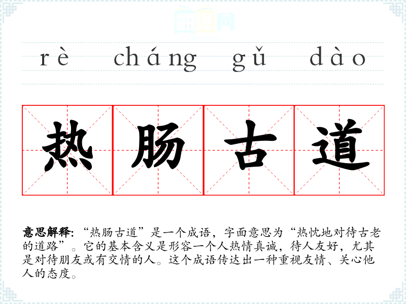 “热肠古道”是一个成语,字面意思为“热忱地对待古老的道路”。它的基本含义是形容一个人热情真诚,待人友好,尤其是对待朋友或有交情的人。这个成语传达出一种重视友情、关心他人的态度。