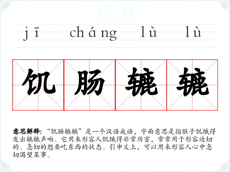 “饥肠辘辘”是一个汉语成语,字面意思是指肚子饥饿得发出辘辘声响。它用来形容人饥饿得非常厉害,常常用于形容迫切的、急切的想要吃东西的状态。引申义上,可以用来形容人心中急切渴望某事。