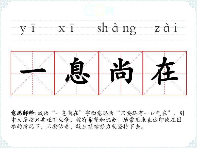 成语“一息尚在”字面意思为“只要还有一口气在”,引申义是指只要还有生命,就有希望和机会。通常用来表达即使在困难的情况下,只要活着,就应继续努力或坚持下去。