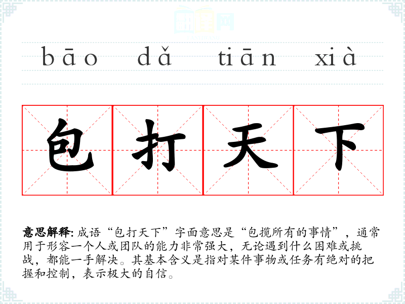 成语“包打天下”字面意思是“包揽所有的事情”,通常用于形容一个人或团队的能力非常强大,无论遇到什么困难或挑战,都能一手解决。其基本含义是指对某件事物或任务有绝对的把握和控制,表示极大的自信。