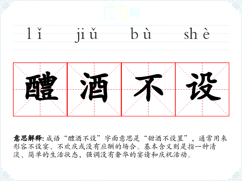 成语“醴酒不设”字面意思是“甜酒不设置”,通常用来形容不设宴、不欢庆或没有应酬的场合。基本含义则是指一种清淡、简单的生活状态,强调没有奢华的宴请和庆祝活动。