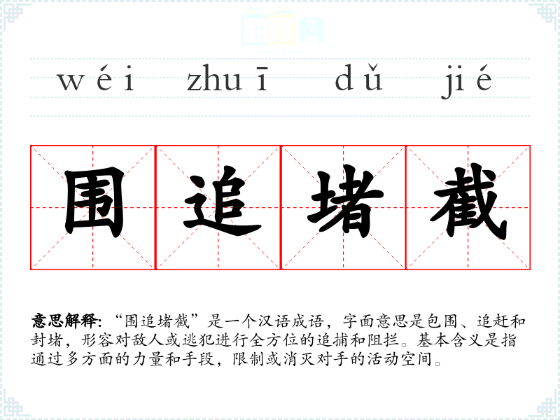 “围追堵截”是一个汉语成语,字面意思是包围、追赶和封堵,形容对敌人或逃犯进行全方位的追捕和阻拦。基本含义是指通过多方面的力量和手段,限制或消灭对手的活动空间。