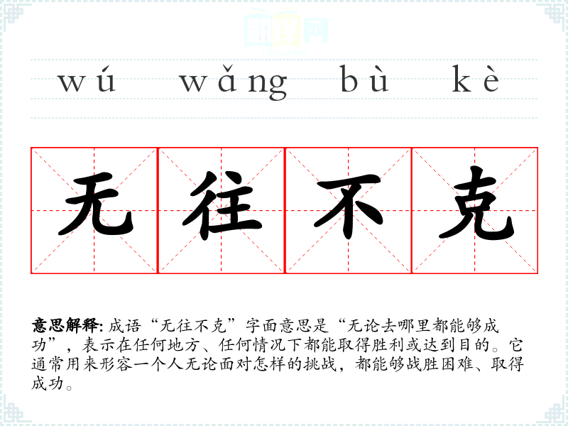 成语“无往不克”字面意思是“无论去哪里都能够成功”,表示在任何地方、任何情况下都能取得胜利或达到目的。它通常用来形容一个人无论面对怎样的挑战,都能够战胜困难、取得成功。